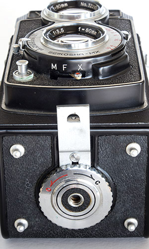 The Yashicaflex A-II had auto-stop film winding so needed a release button in the film winding knob. Early cameras, until the press button shutter was introduced, generally had a black leatherette insert instead of the film type and/or speed reminders of the more expensive models. All examples with the Y.S.K. shutter and those first few with the Copal shutter and black edge trim to the front lens board panel have a unique style film winding knob with full width knurling similar to the early Yashicaflex A-I and MolfoReflex: