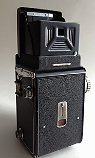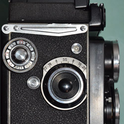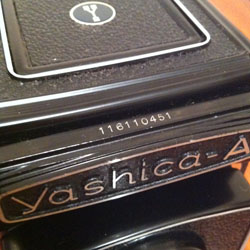 Although released first, basically, an early Yashica A without the hood emblem and film speed reminder on the film winding knob and the red window on the back turned sideways. The reason for the sideways window is that it is the only Yashica 6x6 that can shoot 6x4.5. The sideways window is in fact two windows side by side; the left engraved “6x6” and the right “6x4.5”. This takes advantage of the two sets of numbers on 120 film and allows 15 frames of 6 cm x 4.5 cm instead of the standard 6 cm x 6cm.