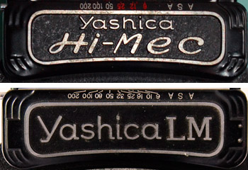 The photographs demonstrate both the similarities of the Hi-Mec to the LM (further below) and key differences noted above. One other difference is in the ASA scales on the top edge of the meter flaps; the slower speeds are shown in red on the Yashica Hi-Mec whereas they are all in white on the LM flap but with more intermediate numbers.