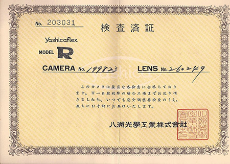 Below is a Japanese guarantee certificate. Note that the model is simply listed as “Yashicaflex Model R” (the certificate is similar to earlier Japanese market Yashicaflex model A-II and C documents except the name of the document and company are in both English and Japanese on those). The fact that it identifies the camera as “Model R” rather than “Rookie” maybe an indicator that the word “rookie” also had no meaning for the vast majority of Japanese consumers.