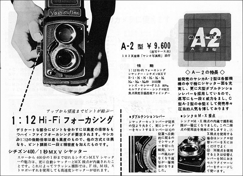 Accepted convention is that this model is called the “Yashicaflex A2” but a Japanese brochure from the period calls it an “A-2”:
