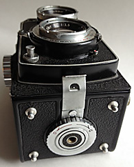 The Yashicaflex A2 has unique film speed reminder graphics on the film winding knob which is shared with the later Yashicaflex A (new model), although that has a centre button instead of leatherette insert. The flags are white on a white background with the outline in the same red and black colour as the text: