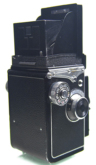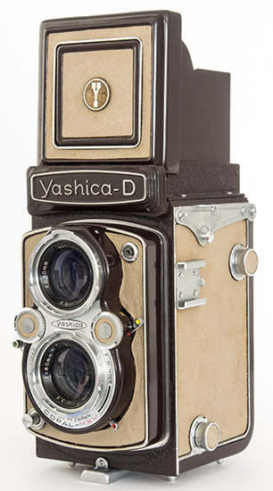 Available in both grey and black, both Sugiyama and McKeown agree on a 1959 introduction as opposed to 1957 for the Mat. From trim details, this is about correct because the camera has features that didn't appear until later in the Mat (and Yashica D). These include the later locking lever, the narrow “Y” hood emblem, the “Yashica” name is in block letters between the lenses and the control wheels are black radial. The name on the circular cover plate under the crank and also on the boxes is “Yashica Co., Ltd.” like the later Mats whereas the early Mats had “Yashima Opt. Ind. Co., Ltd.” and before that, the examples with Lumaxar 75 mm lenses had no writing under the crank.