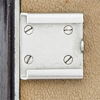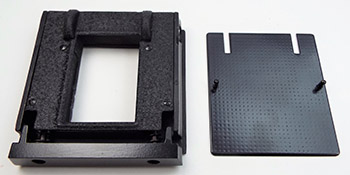 As far as the kit itself, there don't appear to be any changes to how it fits or other significant design alterations. There are some minor differences though. The film guide design changed by, or more likely prior to, the introduction of the second brown kit case. Although the scans at the top are from the same user manual (third type above), the second scan shows the updated later guides with narrow runner strip (as in the photos of the second type above) and the top scan from the same manual shows the original wider runner strip that appeared in all relevant photos in the first two manuals. The pictures below show the first type film guide and pressure plate without the word “Up” and the underneath sides (similar to all). Note that the early pressure plate locating pins are black instead of silver on all later versions: