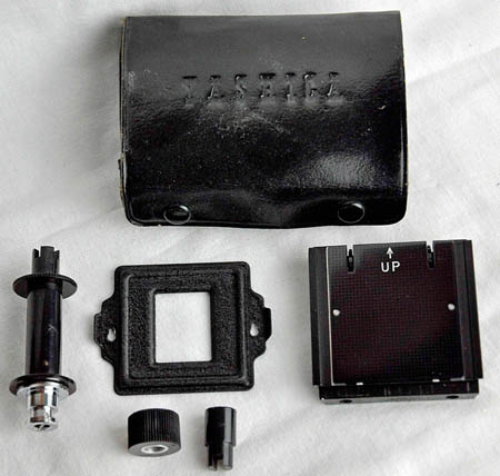 Included in the kit are two spool adaptors for the 35 mm cartridge, a 35 mm take up spool, a pressure plate/ film guide/ sprocket assembly for 35 mm, an insert for the sports finder and a leather case. The two images below are scans from the user manual: