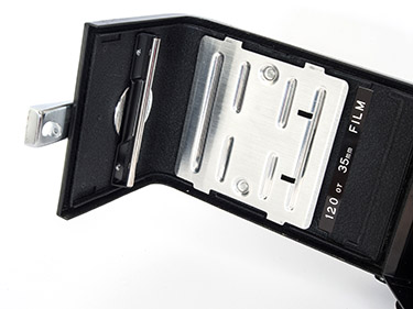 These photos show the kit fitted and also the camera back with cut-outs in the pressure plate for the 35 mm sprockets and the extra guide roller at the bottom in place of the usual fixed bar on other models (except the Yashica Mat-124G which also uses a roller):