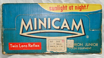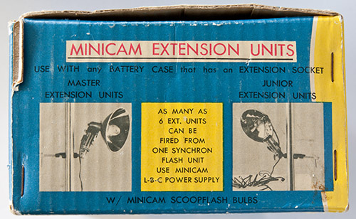 I have photos of a “Minicam Flashgun Junior”. The unit is of recognisably similar design but with more basic finishes and more primitive design features generally. The packaging is a brown cardboard box with simple label with no more than its name displayed. Although there is no mention of the “Synchron” name, there do appear to be connectors allowing the connection of slaves. It seems to be the precursor to the more polished “Synchron Junior”.