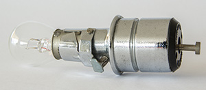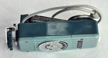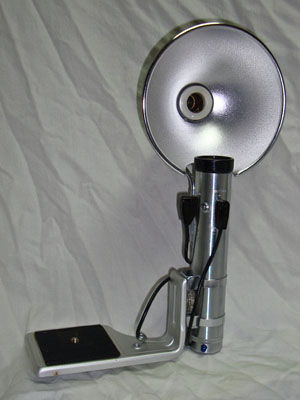 The Synchron units accommodated many types of flashbulbs. On the Junior, there was the bayonet socket in the centre of the reflector (also used for the test bulb) as well as the big socket at the top of the handle for bulbs with ES “medium” size flashbulb bases (as far as I can tell, “medium” refers to a domestic size Edison Screw light bulb base). Some of the Master reflectors didn't have the bayonet socket but adapters were available for the battery case socket to use bulbs with smaller bases. This is a Minicam unit complete with test bulb: