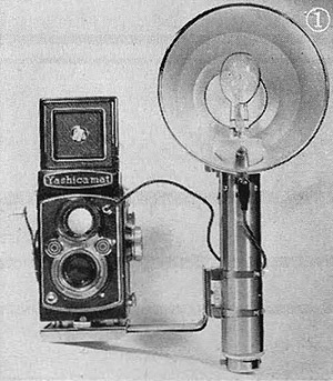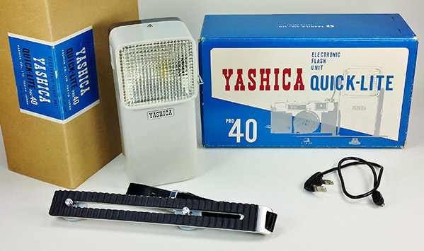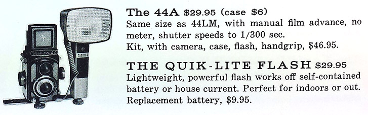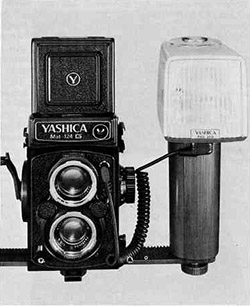 Below is an ad for what may be the original “Yashica Quick-Lite” electronic flash showing it attached to a Yashica 44A: