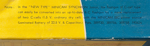 The Synchron flash units are advertised with an “LBC Power Unit”, the LBC referring to “laminated battery and capacitor”. The battery/ capacitor (condenser) power source (commonly called BC units) for flashguns generally started to appear around 1950. For the Minicam models, this comprises a laminated 22.5 volt “C” cell or “D” cell and 500 uF or 700 uF capacitors respectively. These are not mentioned as part of the kit contents (rarely found and extremely unlikely to still work) and although included with Jeff Hellige's unit, there is the question of whether they were usually included or sold as an accessory item. The box is labelled with names where items are stored such as “Bulb” and there is also a spot for “Battery” but none for “Capacitor”. One of the instructions downloadable from the net explains that the “new” Synchron Junior flash can be converted to LBC type by removing the two normal 1.5 volt “C” cells and replacing with the LBC components. As well as Jeff's box, this is also the implication on the side of my box so perhaps the LBC items were optional accessories:
