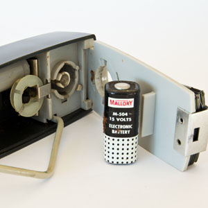 “Unlike yours though, which has the highly polished reflector, mine has a satin reflector. It also came with the cords and the LBC capacitor and battery, though the box states it can use normal C-cell batteries. The LBC 22.5V battery is similar in size and shape to a modern 9V, while the capacitor is like a C-cell with a tab sticking off one end.”