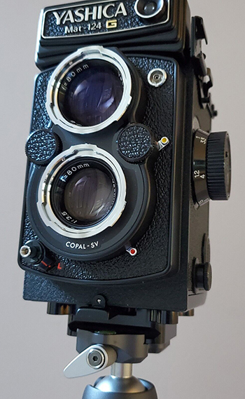 “It’s difficult to put on but does work. You must carefully line up the bayonets then push forcibly until it sits on the taking and viewing lens then rotate the locking lever. Removing is difficult as well. Make sure the Yashica’s lens is focused at infinity, so you don’t force the focusing mount.”