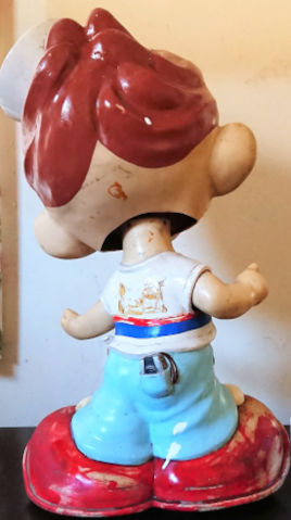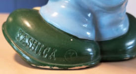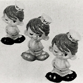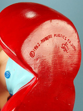 Very little is known about the “sailor boy”. The commonly found ones are about 10 cm, or 4 inches, high. Both the English and Japanese versions are found with the inscriptions under the feet “Made in Japan” and “© 1962 Modern Plastics”.