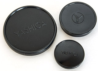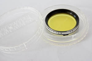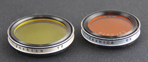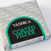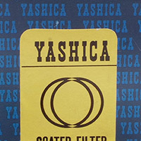 All the filter cases that I have seen are typical circular clear plastic with “YASHICA” across the lid (one shown with yellow filter below), earlier ones in the heavy Serif Western font, late ones in the modern Sans Serif font.