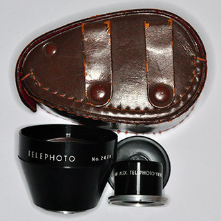 The left close-up lens box below is for a 36 mm push-on set (I have a photo of another in the same style for Bay 1). The last camera model with that bezel size was the Yashica B and both the graphic style and the camera model suggest the 1958 to 1961 period but the set's leather case with the “Yashica” in the oval logo may bring the end date back to 1960. It's a bigger heavy duty box with separate lid and the case and lens set are laid out side by side (see also Close-up Lenses). The right box is for the last type Bay 1 mount close-up lens and complements the similar late lens hood and filter boxes and is almost identical (except for size) to the last telephoto and wide angle lens boxes (not shown). It's a smaller lightweight box with the lens set stored inside its leather case: