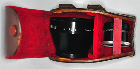 Accessories such as auxiliary lenses and lens hoods were supplied in a leather case. For 66 models, there are both brown and black cases and there are grey cases for coloured hoods (coloured hoods are very rare and I have only seen one grey 66 case and that was for a grey hood). Black accessory cases presumably are from the period that black camera ever ready cases came into being (1965 for the Yashica 24, somewhere around late 1967 for the rest). There are also two styles of black; similar to the brown but in shiny black and a textured black with subtly “modernised” cut to the flap on the lens hood case, I'm guessing from the late Yashica Mat-124G period.
