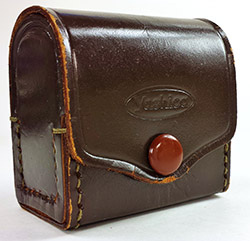 From the collection of Tom Heckhaus, late type “Yashica” from 1966 or later. Still satin-black paint. The earlier black cases were glossier, with a smoother grain texture and “classic” cut to the flap taper much like the earlier brown case above and the 32 mm cases below.