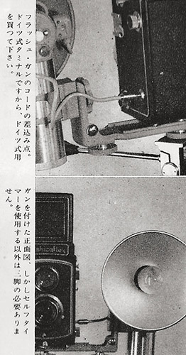 Both flashes also appear in the Japanese language Yashima “Yashicaflex Photography”. The first printing was 5 August 1955, the second printing was 10 August 1955 and the third printing (reprint) was 20 October 1955 (interestingly, the series of model A-II pictures in the two documents are all different to each other but at the same time, very similar using cameras from a similar trim point in time, however, for the English language document, the model, mostly hands shown, is female whilst for the Japanese document, the model is male, even though again it is mostly hands that are visible):