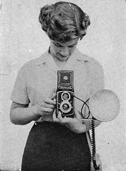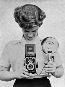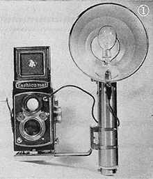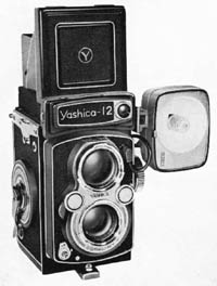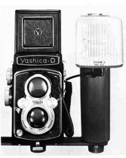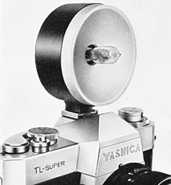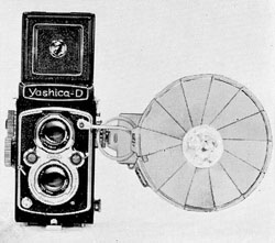 From the same period (in fact same day - same model in the same outfit with the same hair), the similar Yashica C second type user manual (with reset button still) instead shows a dish shaped reflector attached to a straight bracket affixed to the camera's tripod mount (i.e., no riser) with a coiled cord running back to a power pack on a shoulder strap, clearly an early electronic flash unit.