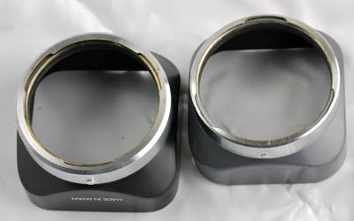 Below is a comparison with the last type lens hood but the shape and screw secured chrome mount had already changed to the squarer shape with riveted mount by the late 1950s: