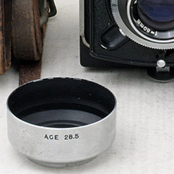 By the time this lens hood was made, the only model left with 32 mm plain filter mounts was the Yashica A (and perhaps its Japanese twin, the Yashica A III). Shown here fitted to a late 1954, early 1955 Yashicaflex A-II. Although the style of the “Yashica” name is out of character, this is only a consideration for collectors and there is no reason why it can't be used on a Pigeonflex, for example.