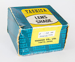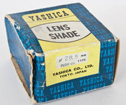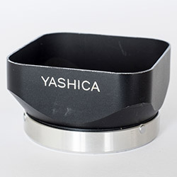 These come in Bay 1 and push-on fittings. For 66 models, at least some Bay 1 types were originally supplied in an orangey brown case, occasionally found with the Yashicaflex C on Japanese sites, then brown and from the mid-1960s, black cases, first in shiny black and then in a textured finish. “Yashica” appears in an oval, in heavy serif block letters or in plain letters corresponding to the camera trim at the time the hoods were produced. The later plain text ones are found in the black cases. The earliest 32 mm push-on hoods have the “Yashica” oval logo and the later type have the heavy serif block letters from the late '50s and early '60s. The cases for both types are brown with the logo/name matching the hood. The only hoods I have seen for 44 series models (both Bay 1 and push-on) are in grey cases and have “Yashica” in the oval.