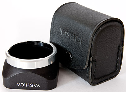 This is the last style lens hood and case, I'd say at least 1970s, or perhaps even later to match the last style Yashica Mat-124G case from about 1981 onward. The hood has a new lightly textured finish and the case has a pronounced leather grain with straighter cut to the flap.