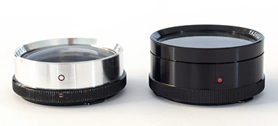 The Bay 1 filters use the inside mount so that lens hoods using the outside mount can be used simultaneously. There are three rim variations found; silver with black retainer similar in appearance to the yellow and orange push-on filters and Bay 1 filters below, all-silver finished and the last ones (certainly from the 1970s on) are finished in black. The all-silver ones appear in some later manuals and brochures together with the all-black version and the script on the silver example I have matches the black, so I would say late 1960s to early 1970s. Some of the silver with black retainer have an earlier style font to others which are otherwise the same. I presume that these are the first type and probably date from the late 1950s.