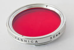 Below are examples of Yashica branded Bay 1 and 32 mm (Yashicaflex A series and earlier and Yashica A and Rookie) and 28.5 mm (Yashica 44A) push-on filters. Presumably, Yashica push-on filters were available for 36 mm as well but I have seen no examples. The Yashica E uses standard 52 mm screw in filters which cover the selenium cell. The first advertising of Yashica filters I have seen is from 1958.