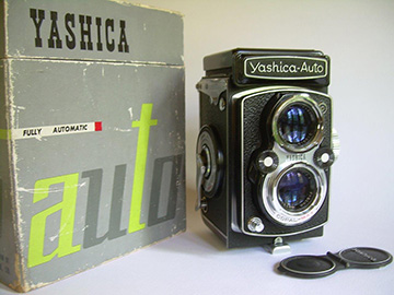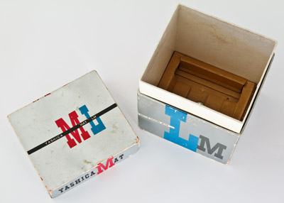 Below are 1957 Yashica-Mat (with Lumaxar 80 mm lenses) and 1960 Yashica Mat-LM boxes:
