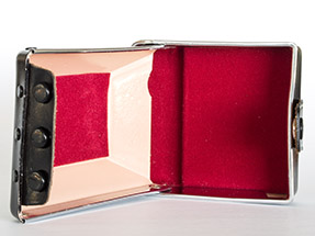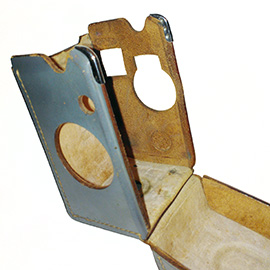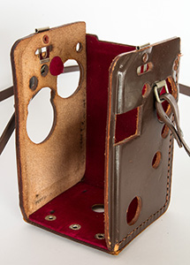 The snout on the first three variations is constructed of a pink plastic overlaid with a very thin veneer of leatherette of some type. The inside of the snout on the fourth variation is a dark synthetic material which may not require a surface veneer. Due to the use of synthetic materials on all variations, the integral leather “hinge” of previous cases which connected the front to the half case is now a separate piece riveted to the bottom of the front piece. The side pieces of all half cases are of a thicker, more flexible fibrous material than the snout and have a thin surface veneer, presumably not of leather. The bottom/back part is thinner but I am not sure of the material. Final fourth case variation shown below.