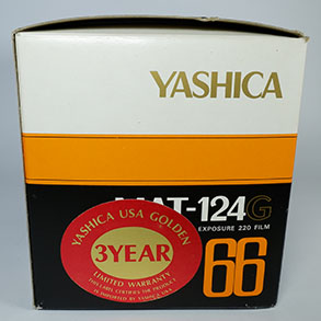 The blue top third of the Yashica D box is darker and more intense than other examples above and below as is the red colour coding compared to the sleeved example below so is more likely to be a feature of the photograph than reality. Except for the unique Yashica Mat-124G boxes, the uniform colour scheme and colour coding of the triangles and “66” for each model is now maintained until the end.