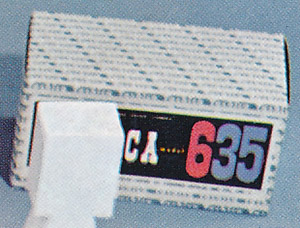 Later in 1965 already came the “66” labelled boxes. The one for the 635 changed to vertical orientation from its first type but is taller than its contemporaries (it is unknown whether there is a 635 version of the red and blue stripe type). All boxes of this type, including the taller 635 box, use the same text, colour, and graphics with the model details on a wrap around adhesive label (similar concept to the previous arrangement). The label is aligned over a black background strip. On this example, the edge is visible near the “A” and note the misaligned triangle on this box and the first 635 example below: