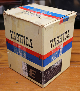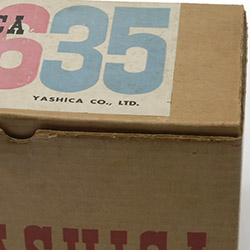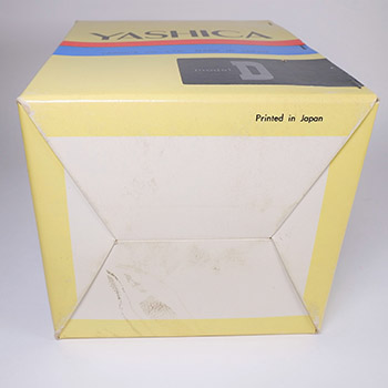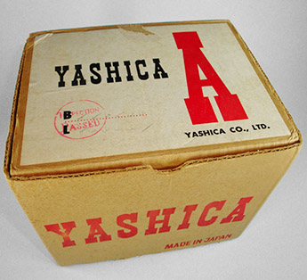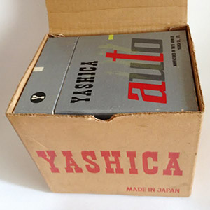 This December 1964 Yashica A box is similar but features “Yashica” in the new font already and a single stapled seam down the back: