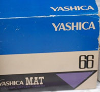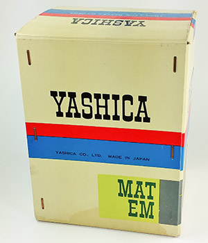 Below left is the Yashica Mat-EM “66” style box introduced after the first red-blue band type further above. Next to it is a similar Yashica-Mat and 1966 (from its camera serial number) Yashica A boxes: