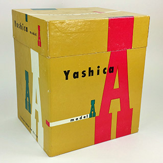 Although already hinted at by the earlier Rookie, the Yashicaflex A2, Yashica A, C and LM, all released in late 1956, set a common graphics style for 66 model boxes until the early 1960s. The main distinguishing differences in this period are the colours of the plain background and model names, e.g. the silver Yashica LM box has a red “L” and a green “M”. The yellow Yashica A box has large red, blue and white “A”s in different places. At least three Japanese market Yashicaflex A (New Model) cameras (marketed as “Yashica A” in Japan) and two Yashica A III cameras (Japanese market Yashica A without hood logo) have been found with the export market Yashica A boxes - it looks like these were shared between all three models: