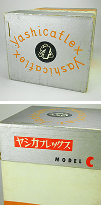 The Yashicaflex C box has a silver lid which on one side has a large orangey-red rectangle with white Japanese characters “ヤシカフレックス” (“Yashicaflex”) and “Model C” in English next to it. Then there is a white band with prominent “Yashicaflex” in black on two sides, the same size orange band with only “Model C” on one side and another silver band on the bottom. Just as with the model AS boxes, earlier boxes feature the maker name “Yashima Kogaku Seiki Co., Ltd.” whereas later boxes from sometime in 1956 onward have “Yashima Optical Ind. Co., Ltd.” As far as I am aware, the Yashicaflex C box is the only one to feature any prominent Japanese characters: