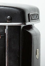 The second variation received a new metallic logo with raised silver letters in a black rectangular background (Nameplate 2) but retained the back half case with strap lugs and locking tabs. To me, the finish appears to be more textured. The third variation still has Nameplate 2 on the front but it received a new half case without the strap lugs and locking tabs as in the first example above. In their place are leather retaining straps which clip over the camera neck-strap now used for carrying the camera/case combo. Also, whilst the first style half case has a taper to the front edge of the sides to replace the earlier stepped design first introduced on the Yashima Flex case, on the later types, the sides are completely slab-like (see first example above), somewhat similar to the first Pigeonflex. I also think that it was at this point that the hole in the bottom of the case for the retainer/tripod adaptor was deleted (not there on fourth and at least some third variation cases). Further details are at Case Retaining Screw/ Tripod Adaptor. The fourth and final variation was a change to some type of matt synthetic textured material and the the logo was simplified to shiny raised letters on a plain black background recessed into the case (Nameplate 3).