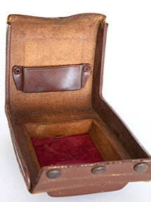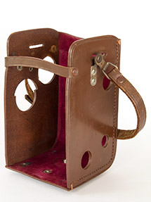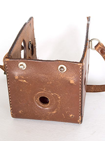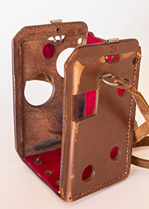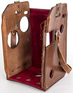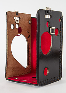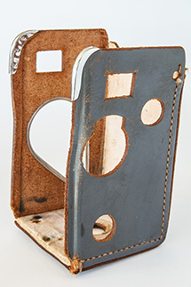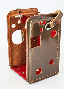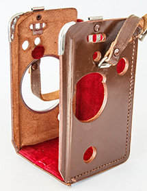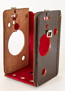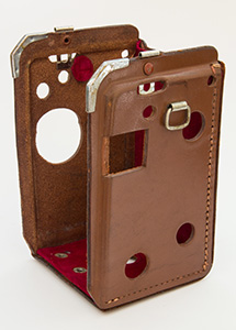A case for a slightly later camera, 31954, is the first with angled corners and red liner but still has the separate stitched and riveted piece over the meter housing and rear-set strap rings. Note that a lower rivet has also been added: