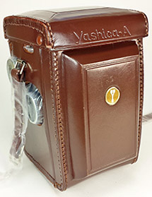The budget Yashicaflex A-I, A-II and later A2 models (and the later more up-market new Yashicaflex AS - see further down) have the same style cases as the earlier types except that the metal logo is replaced by the word “Yashica” inside an oval embossed into the leather (that arrangement is even more Rolleicord-like). However, on very late A-I and A-II cases and on the A2 (and AS), there is no rectangular flat area and the ribbing comes to the edge of the oval.