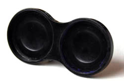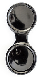 Below right is a typical a push-on black painted pressed metal Yashima Pigeonflex lens cap with a very narrow waist and underlined “PIGEON” in capitals embossed at an angle across the viewing lens part (23 Yashima Pigeonflex cameras in my database have this style, see The Pigeon Loft page for Pigeonflex IA, IB and ID examples). However, the very earliest type may be the same style but without the Pigeon name. Three of the four earliest Pigeonflexes in my database with lens cap, including the earliest, have the plain type, the only jarring aspect is that the second earliest camera has the more typical variety. However, as that also features a late type ever-ready case, the two items may have been replaced. My plain example on the left is exceedingly glossy, albeit with a small dent in the lower part: