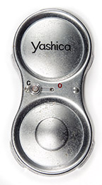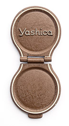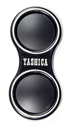 The first soft plastic lens caps (left image) arrived in about September/October1963. These had a protruding tab at the base and pronounced ring depressions cast in much like the earlier hinged and plastic Yashica A types but without the colour. In about March 1965, the simpler and far more common type (second image) appeared. Although “Yashica” is no longer quite as cramped as in the narrow wild west style introduced in the late 1950s in marketing and between the camera's lenses, the lens cap still has a serif font very similar to its predecessor. The only change in the third type is that “Yashica” is in the modern form with a sans-serif font. The second and third types are very difficult to tell apart in photos unless side by side but the change seems to have occurred in mid-1967. The final type was introduced with the release of the Yashica Mat-124G and it only appears to have been supplied with that model. These have a little more character with raised rings inboard from the edge and a sloping, shiny bezel.