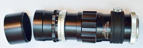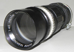 Compared to the 20 cm Super Yashinon-R in the brochure, the only difference is that lens hood is unscrewed and the lens focus has been cranked out to a relatively near position instead of infinity. Below is a 20 cm Super Yashinon-R in M42 mount, sans hood, with focus set at 15 metres/50 feet: