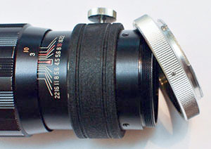 The 20 cm, 30 cm and 40 cm lenses are almost certainly rebadged Tele-Tokinas/Minetars made by Tokyo Koki Co., Ltd., later known as Tokina. The f/3.5 and f/2.8 versions of the 13.5 cm look like they are related to each other but not to the Tokinas. Their origin remains an unknown and I'm still searching for examples that match exactly. There are two different versions of the 3.5 cm lens, at least one is a rebadged Sankor (see below). Except for the first type 3.5 cm black nose, the barrels were threaded for T-mounts (invented by Tamron) to which screwed various dedicated mounts such as M42, Pentamatic and quite a few Super Yashinon-Rs have been found with Minolta mounts. These mounts were locked in place by set screws - changing a mount involved loosening the set screws, unscrewing the mount from the T-mount and then reversing the order with the new mount. Simple and no doubt something which appealed to Yashica with its new two mount SLR range.