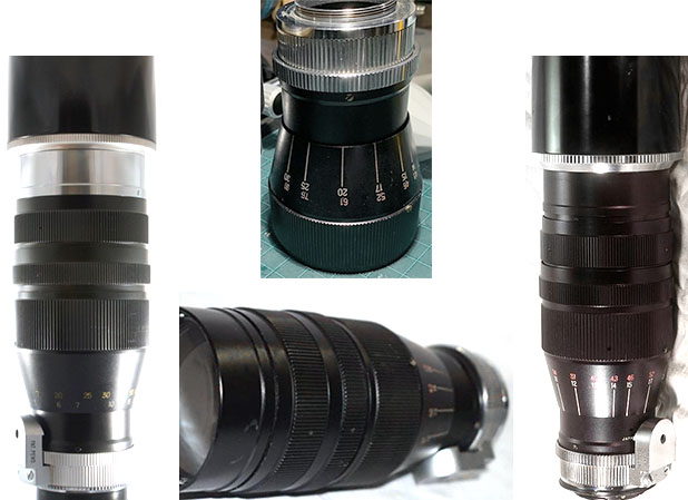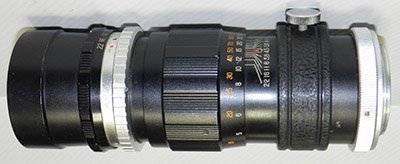 As alluded to earlier, there are two main series of accessory lenses; the silver noses and the black noses. The silver noses have a distinct family similarity to the standard lens and most seem to be designed for the Pentamatic mount, the exception perhaps being the 25 cm which may have a replaceable mount of some type. However, the evidence is mounting that the silver noses can also be be further divided into two; those made by Tomioka and those made by Kyoei Optical Co., Ltd., maker of Yashica's 13.5 cm f/3.5 Super Yashinon for the YE and YF.