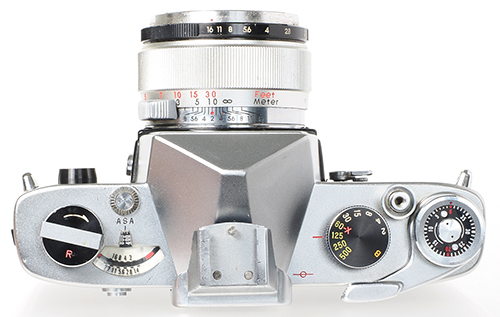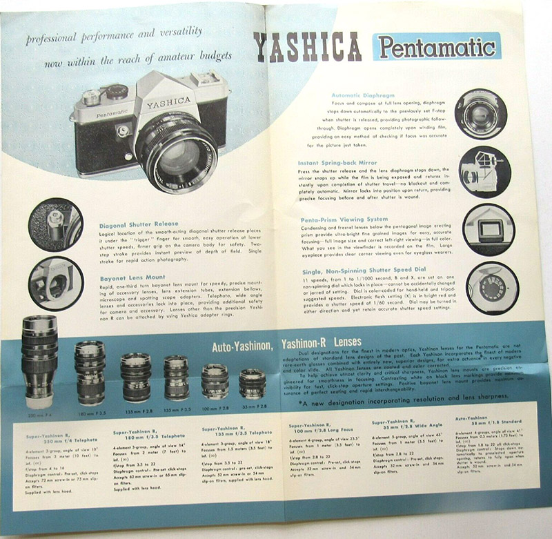 Much was made of the camera's automatic aperture diaphragm stop down ability but only the standard Auto Yashinon f/1.8 5.5 cm lens was “automatic” and even that was a marketing stretch - yes, the aperture diaphragm automatically stopped down at the time the shutter was released but as noted above, the return of the aperture diaphragm to fully open for viewing was only accomplished by cocking the shutter again. Although state of the art only a year or two earlier on cameras such as the 1958 Minolta SR-2 and earlier German cameras, the Zunow, Nikon F and Canonflex had already established the fully automatic standard as we understand it with others soon following. Asahi announced the S3 (H3 in the US) with an Auto Takumar lens at Photokina in 1960 (released in 1961) and Minolta added the feature to its then current flagship, the SR-3, in 1961 and then extended it to its budget model, the SR-1. As noted below, the rare and short-lived Japan only Pentamatic II did feature a fully automatic aperture so Yashica knew how to build one but again omitting it from the last model, the Pentamatic S, was almost certainly another factor in its early demise.