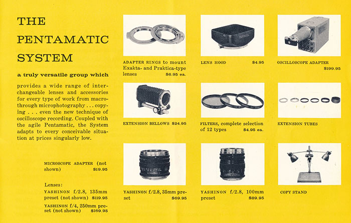 This is The Pentamatic System page from a 1960 US brochure (note, the 135 mm and 250 mm lenses are not pictured but are mentioned):