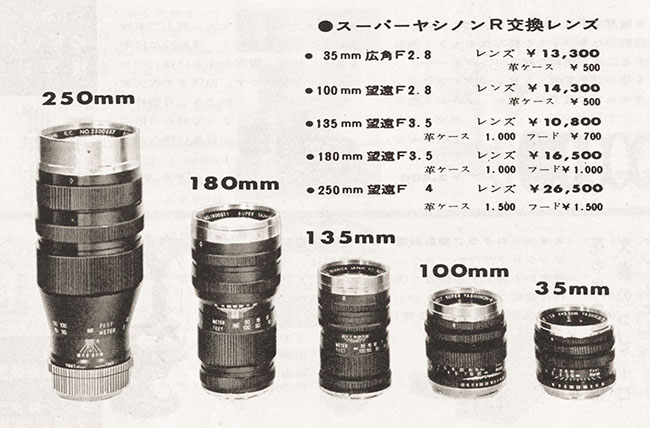 The Acall noses in the catalogue are black and the Super Yashinon-Rs and the Acall above are chrome. The Super Yashinon and Acall 25 cm lenses below share the same unusual tripod mount and general detailing: