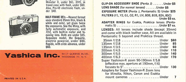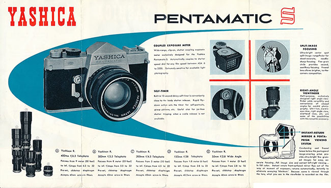 Nearly every reference source implies that the Pentamatic's “proprietary” bayonet lens mount was an impediment to the camera's sales success. Well, yes, if you don't have many desirable lenses to offer, but what has to be understood is that every successful bayonet lens mount, including the Nikon F mount, was/is “proprietary” and were usually accompanied by an ever increasing selection of matching lenses specifically designed for the system. In Comparison of Yashica and Minolta SLRs further below, I have compared the Pentamatic models to Minolta's early offerings. The Minolta SLRs with their bayonet mount were quite successful in the Yashica Pentamatic/M42 period.