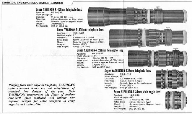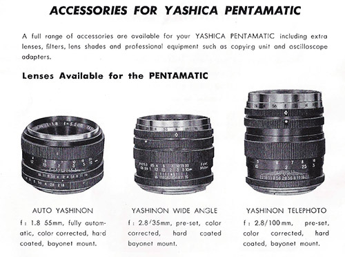 I think that the first series and second series images in the brochures and the differing focal lengths and filter thread sizes (see table above) make it very clear that the lenses are not related. The abrupt change of direction by Yashica seems to be related to the desire for lenses to be suitable for either mount and to be available immediately. I suspect that by this time, Yashica knew that the Pentamatic and its mount were on borrowed time and maybe the wholesale move of the earlier Pentamatic lenses to the interchangeable mount series was to allay the possible ill-will from people buying a lens for their Pentamatic only to be stuck with an unsupported mount in the future?